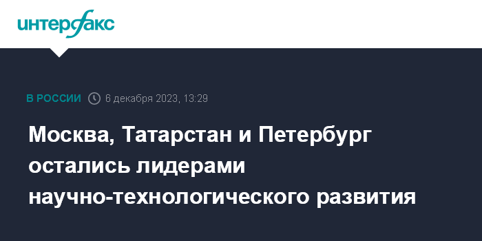 Москва. 6 декабря. INTERFAX.RU - Москва, Татарстан и Санкт-Петербург сохранили лидерство в научно-технологическом развитии среди всех регионов РФ по итогам 2022 года, сообщил вице-премьер Дмитрий Чернышенко.