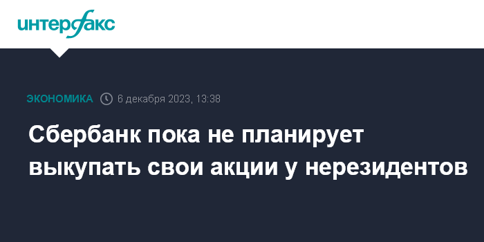 Москва. 6 декабря. INTERFAX.RU - Сбербанк вновь заявил, что пока не планирует выкупать свои акции у нерезидентов.
