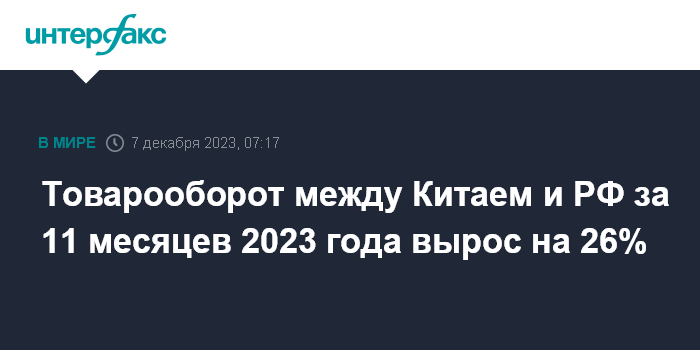 Товарооборот между Китаем и РФ за 11 месяцев 2023 года вырос на 26%