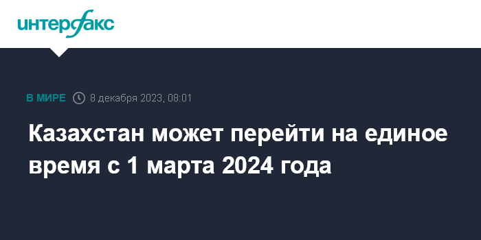 Москва. 8 декабря. INTERFAX.RU - Единый часовой пояс в Казахстане может быть установлен с 1 марта 2024 года. Соответствующий проект постановления правительства опубликован на сайте министерства торговли и интеграции республики.