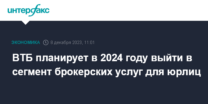ВТБ планирует в 2024 году выйти в сегмент брокерских услуг для юрлиц