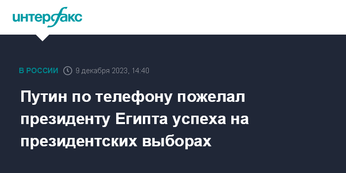 Москва. 9 декабря. INTERFAX.RU - Состоялся телефонный разговор президента России Владимира Путина с президентом Египта Абдель Фаттахом ас-Сиси.