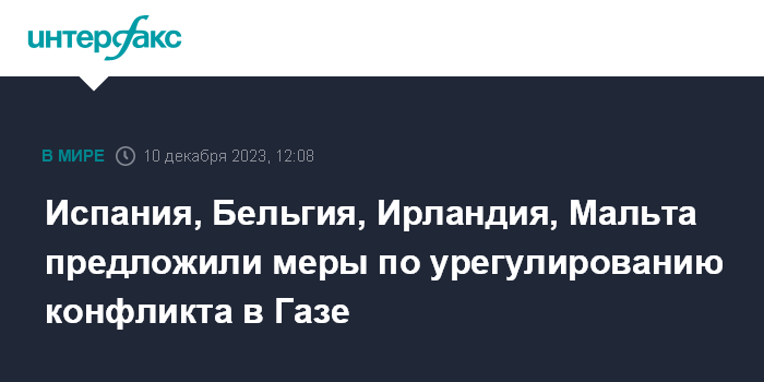 Москва. 10 декабря. INTERFAX.RU - Испания, Бельгия, Ирландия и Мальта выступили с совместной инициативой по урегулированию конфликта в секторе Газа, сообщает в субботу испанская радиостанция Cadena SER.
