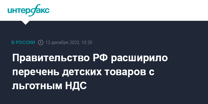 Москва. 12 декабря. INTERFAX.RU - Правительство РФ расширило перечень детских товаров, облагаемых НДС по сниженной ставке 10%.