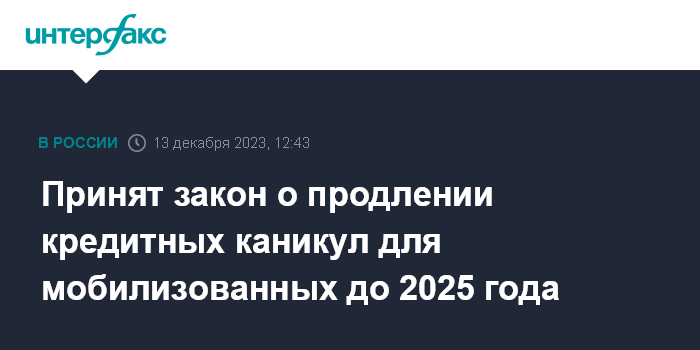 Москва. 13 декабря. INTERFAX.RU - Госдума приняла закон о продлении кредитных каникул для мобилизованных до 2025 года; в документе также уточняется, что банки не смогут требовать досрочного возврата кредита, если поручитель по нему был мобилизован и погиб.