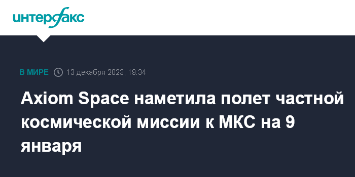 Москва. 13 декабря. INTERFAX.RU - Полет третьей миссии частных астронавтов компании Axiom Space на Международную космическую станцию - Ax-3 - запланирован на 9 января 2024 года, сообщила компания.