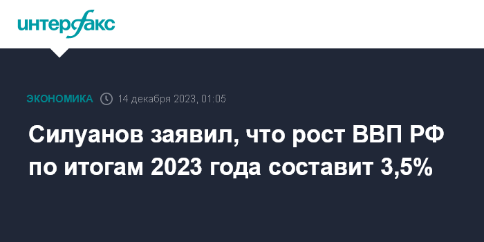 Москва. 14 декабря. INTERFAX.RU - Российский ВВП по итогам 2023 года вырастет на 3,5%, заявил министр финансов РФ Антон Силуанов в интервью, опубликованном в четверг в газете "Известия".
