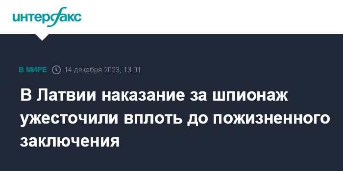 Москва. 14 декабря. INTERFAX.RU - Сейм Латвии принял в окончательном чтении поправки к Уголовному закону, которые ужесточают ответственность за преступления против госбезопасности, в том числе предусмотрено пожизненное заключение за некоторые преступления, сообщает агентство ЛЕТА.