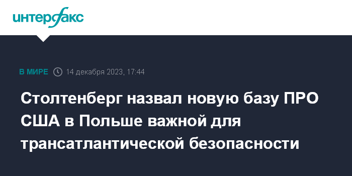 Москва. 14 декабря. INTERFAX.RU - Предстоящий ввод в строй американской базы ПРО в Польше станет важным шагом в укреплении трансатлантической безопасности, заявил через пресс-службу генсек НАТО Йенс Столтенберг.