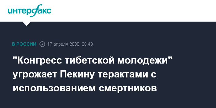 Пекин. 17 апреля. INTERFAX.RU - Так называемый председатель антикитайской организации "Конгресс тибетской молодежи" Цэван Жигзин в интервью итальянской газете, данном в Индии, заявил, что его организация готовится к проведению террористических актов с использованием смертников, сообщили в четверг китайские СМИ.
