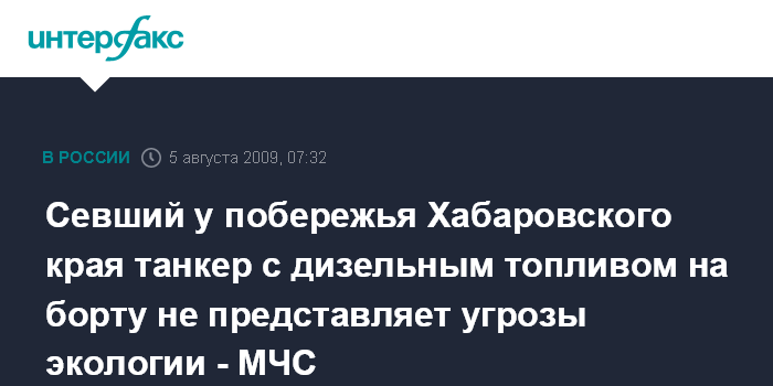 Севший у побережья Хабаровского края танкер с дизельным топливом на борту не представляет угрозы экологии - МЧС