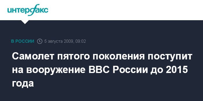 Москва. 5 августа. INTERFAX.RU - Самолеты пятого поколения к 2015 году будут стоять на вооружении ВВС России, заявил журналистам в среду главком ВВС генерал-полковник Александр Зелин. Он также сообщил, что "во втором полугодии 2009 г. самолет выходит на летные испытания".