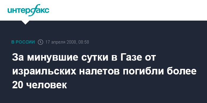 Лондон/Иерусалим. 17 апреля. INTERFAX.RU - По меньшей мере 22 палестинца, в том числе пятеро детей, погибли во время ударов, нанесенных по сектору Газа вертолетами израильских ВВС, сообщает в среду телерадиокомпания Би-Би-Си.