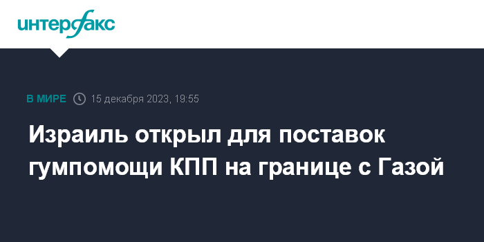 Москва. 15 декабря. INTERFAX.RU - Израильское правительство в пятницу впервые после начала конфликта в секторе Газа открыло КПП "Керем Шалом" для фур с гуманитарной помощью, сообщает The Times of Israel.