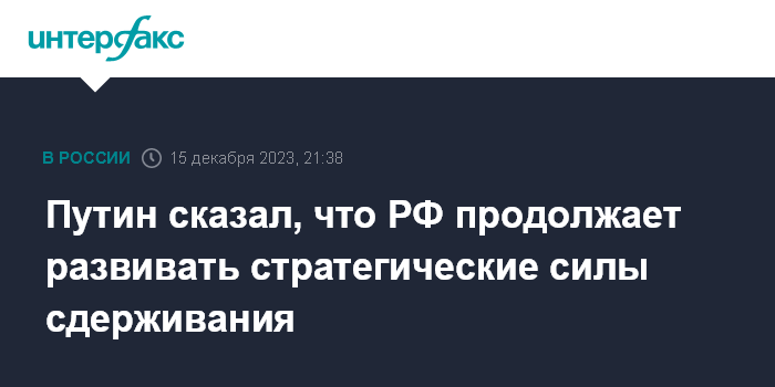 Москва. 15 декабря. INTERFAX.RU - Россия, несмотря на сложный период, продолжает развитие стратегических сил сдерживания, заявил президент РФ Владимир Путин.
