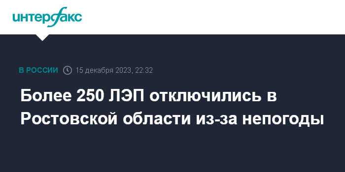 Москва. 15 декабря. INTERFAX.RU - Непогода привела к отключению 266 линий электропередачи в Ростовской области на 21:00 по Москве пятницы, сообщил губернатор региона Василий Голубев.