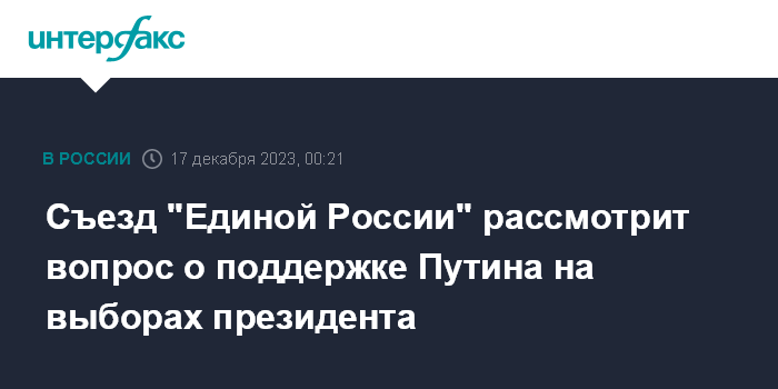 Москва. 17 декабря. INTERFAX.RU - В воскресенье состоится съезд партии "Единая Россия", который рассмотрит вопрос о поддержке выдвижения Владимира Путина кандидатом на выборах президента РФ.