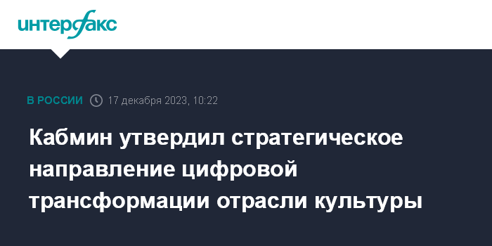 Москва. 17 декабря. INTERFAX.RU - Премьер-министр России Михаил Мишустин подписал распоряжение об утверждении стратегического направления цифровой трансформации отрасли культуры, сообщает в воскресенье сайт правительства РФ.
