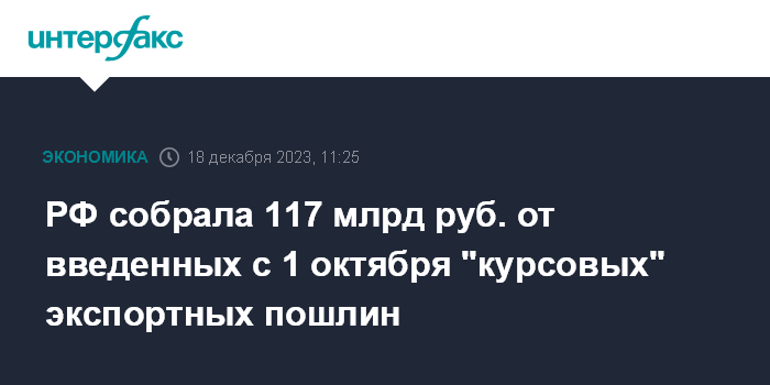 Москва. 18 декабря. INTERFAX.RU - Федеральная таможенная служба (ФТС) РФ с момента введения "курсовых" экспортных пошлин 1 октября 2023 года собрала с компаний-экспортеров 117 млрд рублей, сообщил врио главы ФТС Руслан Давыдов в интервью телеканалу "Россия 24".