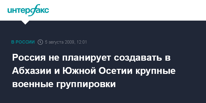 Москва. 5 августа. INTERFAX.RU - Россия не намерена создавать крупные группировки войск на границе с Грузией в Абхазии и Южной Осетии, заявил замначальника Генштаба РФ генерал-полковник Анатолий Ноговицын. По его словам, российские военные внимательно следят за развитием обстановки в регионе, возможными угрозами и их значимостью и "просчитывают, какие последствия могут за тем или иным этапом последовать".