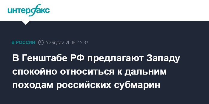 Москва. 5 августа. INTERFAX.RU - Дальние походы российских атомных подводных лодок - это нормальный процесс, заявил замначальника российского Генштаба генерал-полковник Анатолий Ноговицын, комментируя сообщения американских СМИ о появлении у берегов США двух атомных субмарин ВМФ РФ. "Флот тоже не должен стоять у стенки, сидеть, сложа рукава. Мы тоже про них можем заявить, где они бывают, поэтому это нормальный процесс", - сказал генерал на пресс-конференции в среду в Москве.