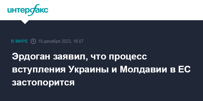 Москва. 19 декабря. INTERFAX.RU - Президент Турции Реджеп Тайип Эрдоган во вторник заявил, что переговоры Украины и Молдавии с ЕС о вступлении в Евросоюз затянутся на неопределенное время, как это случилось с его собственной страной.
