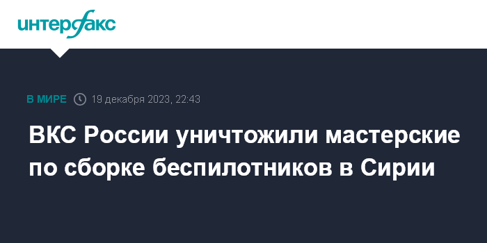 Москва. 19 декабря. INTERFAX.RU - Российская военная авиация групповым ударом уничтожила в сирийском городе Идлиб принадлежащие НВФ мастерские по сборке беспилотников, сообщил заместитель руководителя российского Центра по примирению враждующих сторон в Сирии контр-адмирал Вадим Кулить.