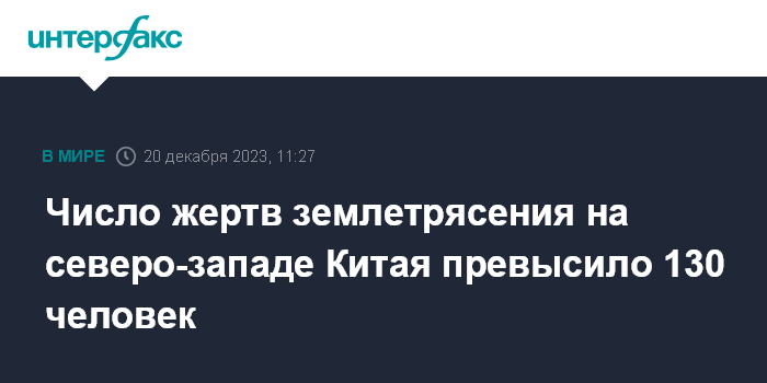 Москва. 20 декабря. INTERFAX.RU - Число погибших в результате землетрясения в китайских провинциях Ганьсу и Цинхай возросло до 131, сообщает в среду "Синьхуа".