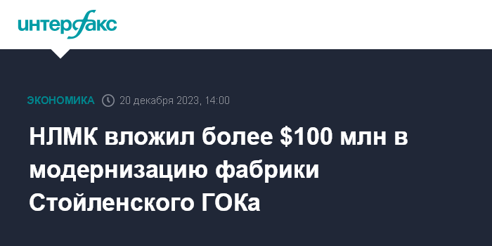 Москва. 20 декабря. INTERFAX.RU - Группа НЛМК модернизировала оборудование обогатительной фабрики Стойленского горно-обогатительного комбината (СГОК, Белгородская область), объем инвестиций составил более $100 млн, сообщила группа.