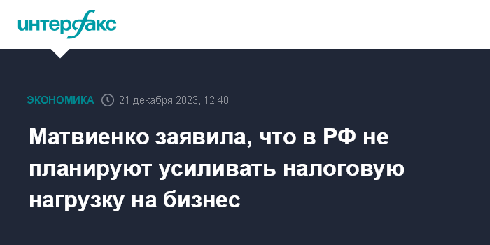 Москва. 21 декабря. INTERFAX.RU - Налоговую нагрузку на бизнес в России усиливать не планируется, заявила председатель Совета Федерации Валентина Матвиенко.