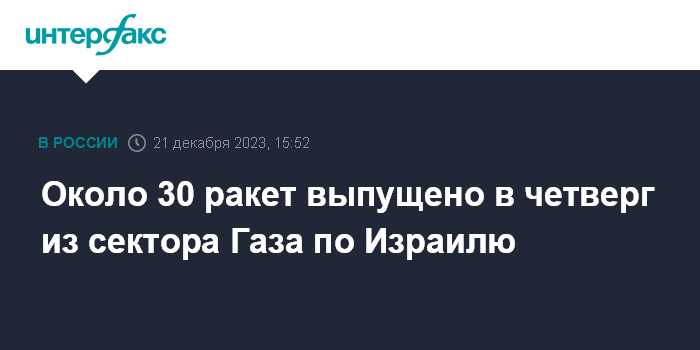 Москва. 21 декабря. INTERFAX.RU - Не менее 30 ракет запустили в четверг из сектора Газа по Израилю, средства ПВО перехватили ракеты над центральной и южной частью страны, сообщает The Times of Israel.