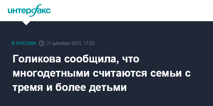 "Хочу сказать, что в соответствии с вашим поручением, мы обсудили и пришли к однозначному пониманию, каков критерий многодетной семьи в РФ - это три ребенка и более. И сейчас мы в соответствии с вашим поручением завершаем работу над мерами поддержки многодетной семьи и об этом в ближайшее время будет доложено дополнительно", - сказала Голикова в четверг на заседании Совета по стратегическому развитию и нацпроектам с участием президента РФ Владимира Путина.