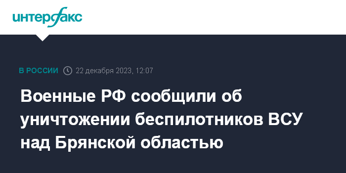 Москва. 22 декабря. INTERFAX.RU - Над Брянской областью сбиты украинские беспилотники, сообщили в Минобороны РФ.