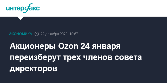 Москва. 22 декабря. INTERFAX.RU - Акционеры Ozon переизберут трех членов совета директоров – соответствующий пункт включен в повестку годового собрания, запланированного на 24 января.