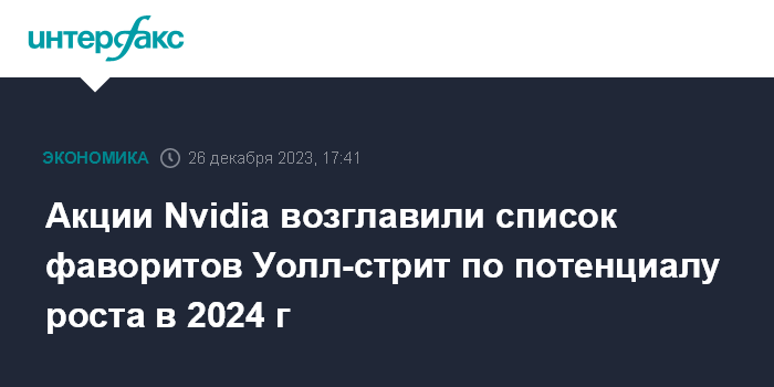 Москва. 26 декабря. INTERFAX.RU - Акции американского производителя чипов Nvidia Corp. возглавили список фаворитов Уолл-стрит по потенциалу роста в 2024 году, пишет MarketWatch.