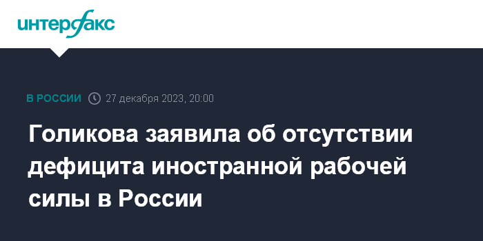 Москва. 27 декабря. INTERFAX.RU - Вице-премьер Татьяна Голикова заявила, что в России сейчас отсутствует дефицит иностранной рабочей силы.