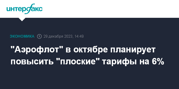 Москва. 29 декабря. INTERFAX.RU - "Аэрофлот" в октябре 2024 года планирует повысить на 6% "плоские" (то есть не меняющиеся в течение года) тарифы, которые действуют на рейсах группы в пункты Дальнего Востока и Калининград.