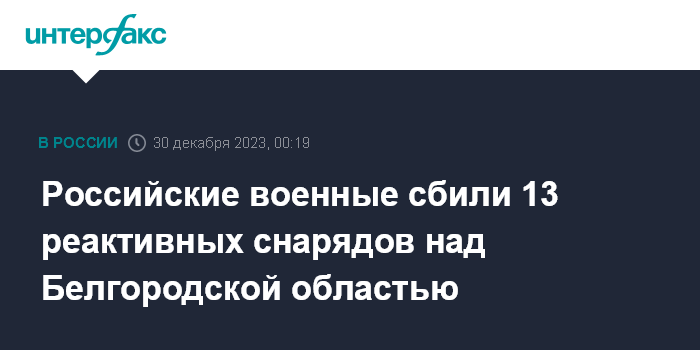 Москва. 30 декабря. INTERFAX.RU - Министерство обороны России заявило, что вечером в пятницу силы противовоздушной обороны сбили 13 реактивных снарядов системы залпового огня в небе над Белгородской областью.