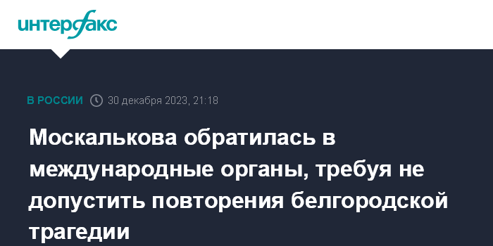 Москва. 30 декабря. INTERFAX.RU - Уполномоченный по правам человека в РФ Татьяна Москалькова заявила, что обратилась в международные органы с требованием осудить факт нарушения международного гуманитарного права, который имел место при обстреле Белгорода, принять меры к недопущению подобных ситуаций.