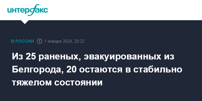 Москва. 1 января. INTERFAX.RU - После эвакуации в Москву 20 из 25 пострадавших при обстреле Белгорода 30 декабря, находятся в стабильном, но тяжелом состоянии, сообщили журналистам в пресс-службе федерального Минздрава.
