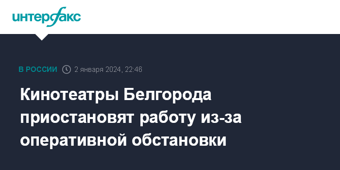 Москва. 2 января. INTERFAX.RU - Власти Белгорода сообщили о приостановке работы кинотеатров в связи с оперативной обстановкой.