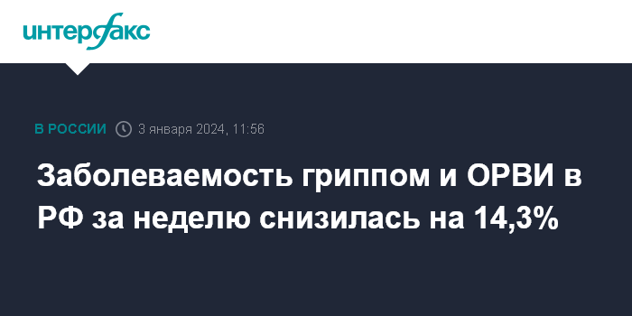 Москва. 3 января. INTERFAX.RU - Число случаев заболевания гриппом и ОРВИ в России за неделю снизилось более чем на 14%. Более 20% от всех случаев ОРВИ и гриппа приходится на Москву, Санкт-Петербург и Подмосковье, сообщили в Роспотребнадзоре.