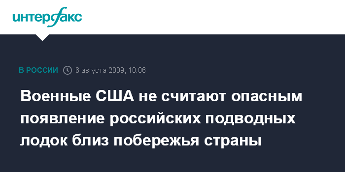 Москва. 6 августа. INTERFAX.RU - Появление двух российских атомных подлодок у восточного побережья США не встревожило Пентагон, передает британская телерадиовещательная корпорация BBC. Как заявил пресс-секретарь министерства обороны США Джефф Моррелл, российские подлодки действуют в международных водах. По его словам, это не вызывает у Вашингтона опасений.