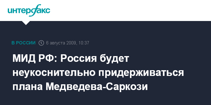 МИД РФ: Россия будет неукоснительно придерживаться плана Медведева-Саркози