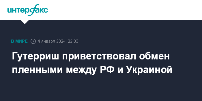 Москва. 4 января. INTERFAX.RU - Генсек ООН Антониу Гутерриш приветствует обмен военнопленными между Россией и Украиной, рассчитывает на дальнейшие усилия по деэскалации между сторонами, заявила в четверг представитель генсека Стефани Трембле.