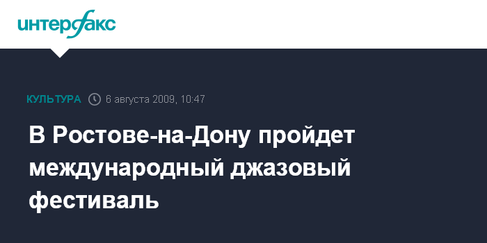 Москва. 6 августа. INTERFAX.RU - В Ростове-на-Дону в рамках празднования 260-летнего юбилея города пройдет четвертый Международный джазовый фестиваль "Ростовский джаз приглашает". Как сообщает пресс-служба мэрии города, фестиваль пройдет в донской столице с 16 по 23 сентября. В нем смогут принять участие профессиональные джаз-бэнды и музыканты, студенты высших и средних специализированных учебных заведений Ростова-на-Дону, городов-побратимов, городов ближнего и дальнего зарубежья.