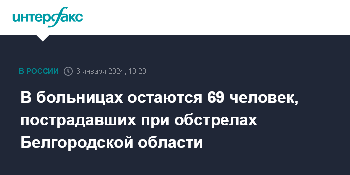 Москва. 6 января. INTERFAX.RU - В настоящее время в больницах Москвы и Белгорода находятся 69 человек, госпитализированных после украинских обстрелов, сообщил губернатор Белгородской области Вячеслав Гладков в своем телеграм-канале в субботу.