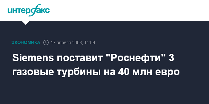 Москва. 17 апреля. INTERFAX.RU - Германский концерн Siemens поставит ОАО "Нефтяная компания "Роснефть" 3 газовые турбины SGT-800 номинальной мощностью по 45 МВт, сообщила пресс-служба Siemens.