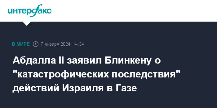 Москва. 7 января. INTERFAX.RU - Иорданский король Абдалла II принял госсекретаря США Энтони Блинкена и заявил ему о "катастрофических последствиях" продолжения военной операции Израиля в секторе Газа, сообщает газета Times of Israel.