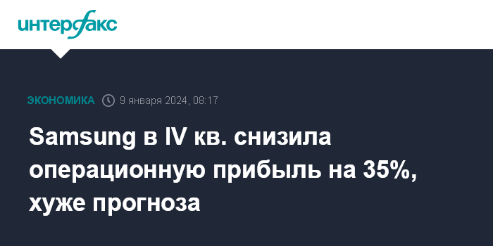 Москва. 9 января. INTERFAX.RU - Операционная прибыль Samsung Electronics в четвертом квартале упала на 35% и составила около 2,8 трлн вон ($2,13 млрд) по сравнению с 4,31 трлн вон за аналогичный период 2022 года, говорится в предварительной отчетности южнокорейской компании.